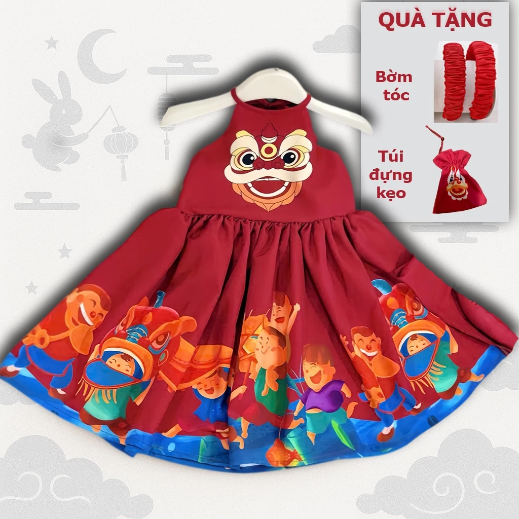 🔥 [Tặng bờm+túi] Set váy yếm lân đỏ cách điệu cho bé mặc đi đám cưới đi chơi sự kiện thu 9-32KG đang giảm giá!